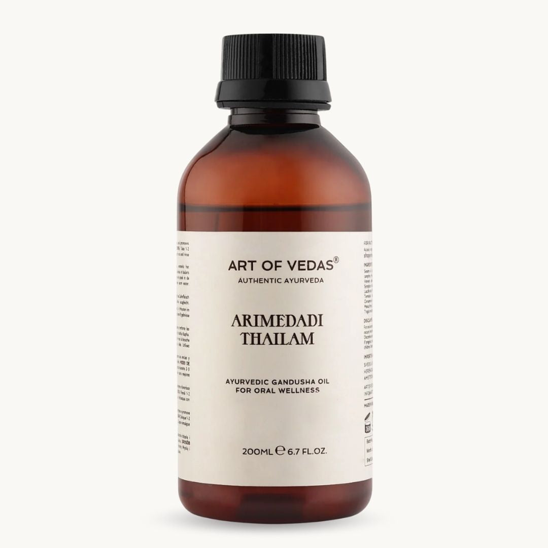 Art of Vedas Arimedadi Thailam, ensiluokkainen ayurvedinen valmiste, joka on valmistettu suunhoidon ulkopuolisten hyötyjen vuoksi. Tämä yrttiöljy auttaa lievittämään tulehdusta ja kipua eri kehon osissa, tarjoten rauhoittavan vaikutuksen mielelle ja parantaen yleistä hyvinvointia.