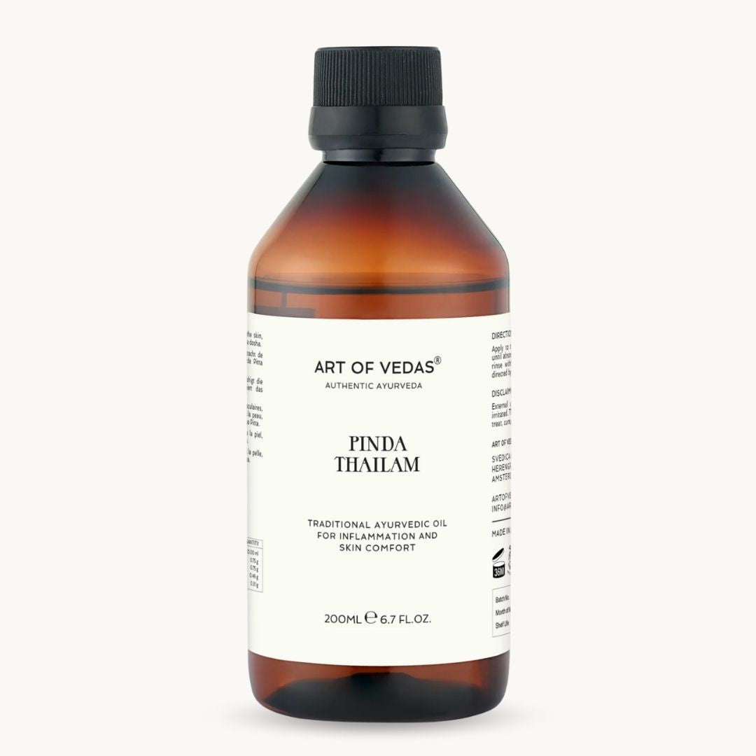 Kendt i Ayurveda for sin Sheeta Virya (kølende styrke), værdsættes Pinda Thailam traditionelt for at balancere Pitta dosha og berolige områder med overskydende varme. Den naturlige bivoks giver denne olie sin karakteristiske halvfaste tekstur ved køligere temperaturer — varm blot forsigtigt op før brug. Særligt værdsat til lokal påføring, hvor kølende støtte ønskes.