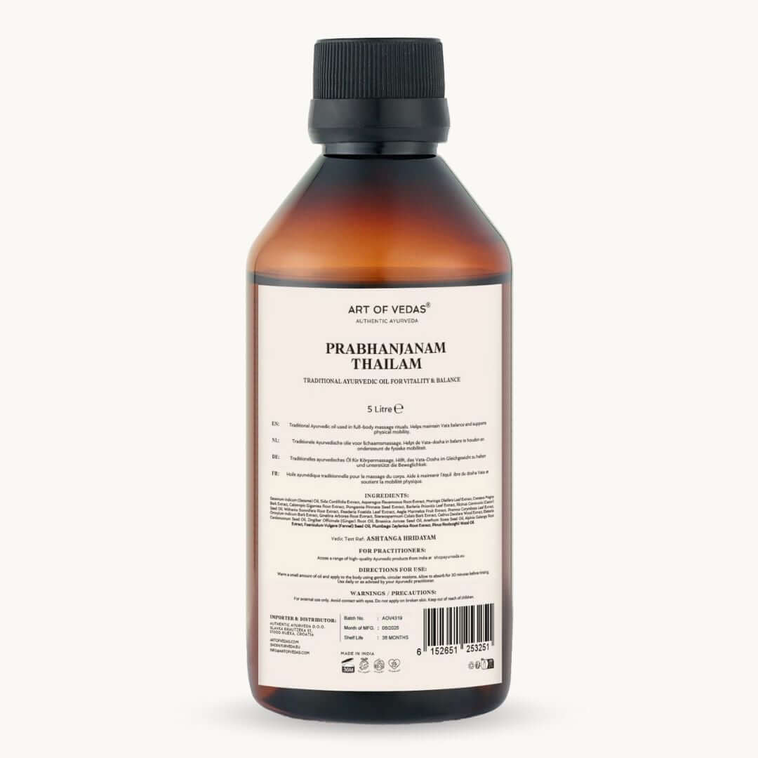 Prabhanjanam Thailam is traditionally used as a nervine tonic to nourish the nervous system and support healthy muscle function. The combination of Bala (known for strengthening muscles and nerves), Ashwagandha (a powerful adaptogen), and Dashamoola creates a formula that supports the body's natural ability to maintain comfortable nerve and muscle activity.