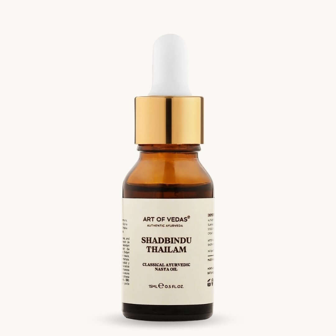 Shadbindu Thailam er specielt formuleret til nasal administration (Nasya). Må ikke påføres huden, indtages direkte eller bruges i øjne eller ører.